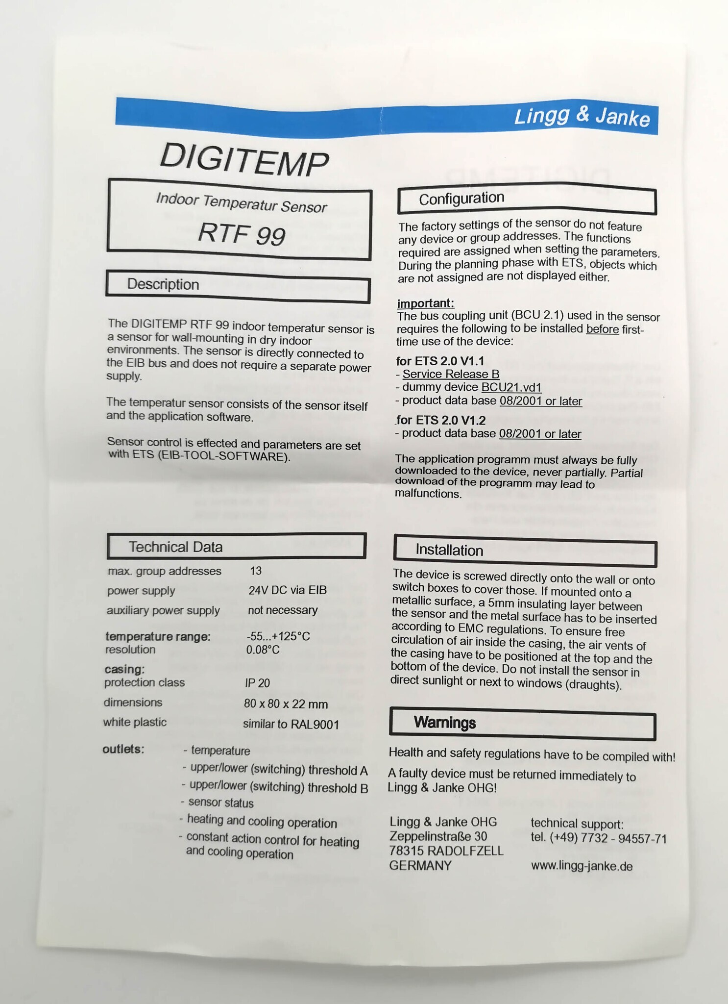 Датчик температуры в помещении LINGG-JANKE RTF 99 (89140) датчик для настенного монтажа в сухом помещении среды Konnex System