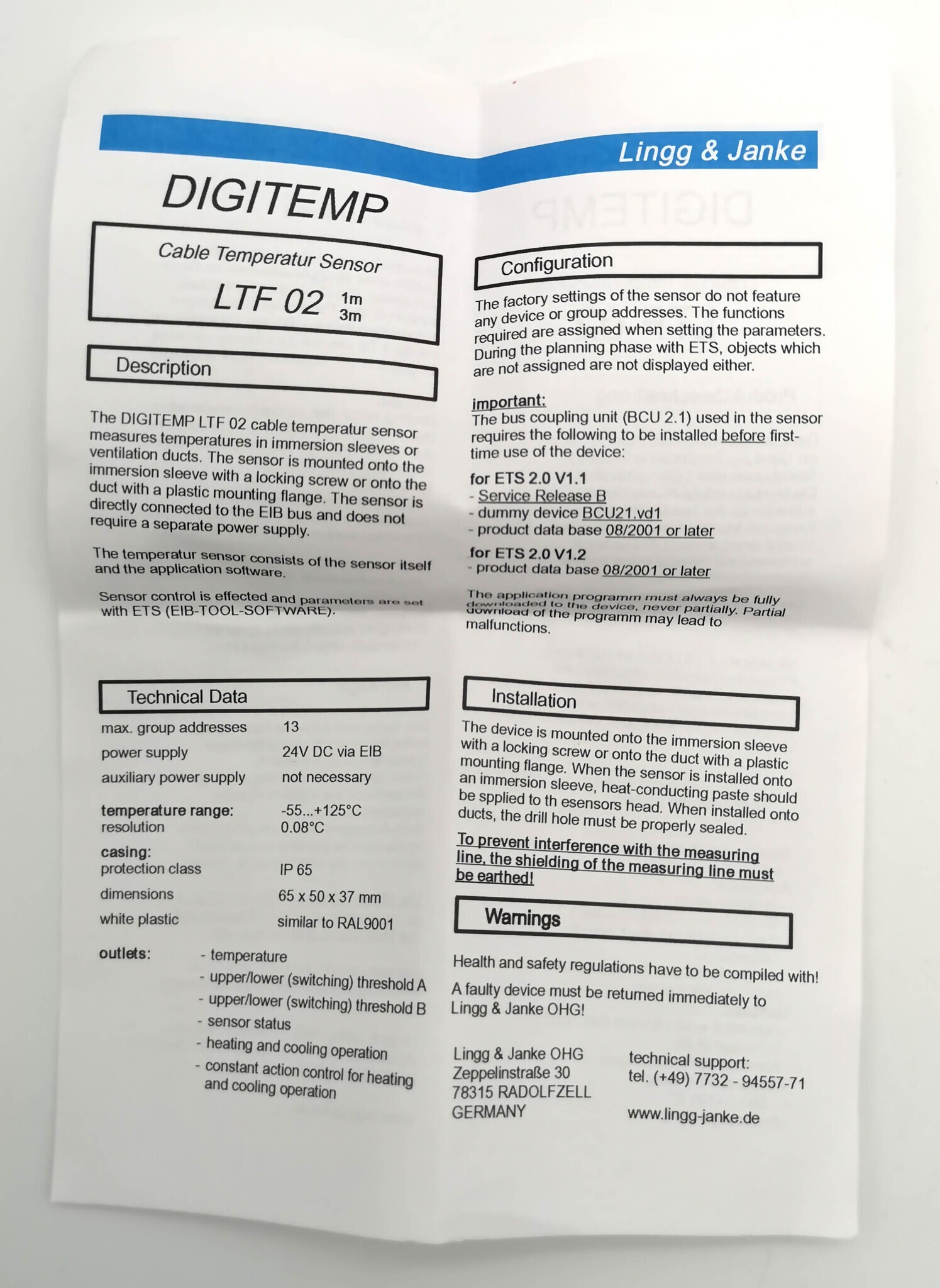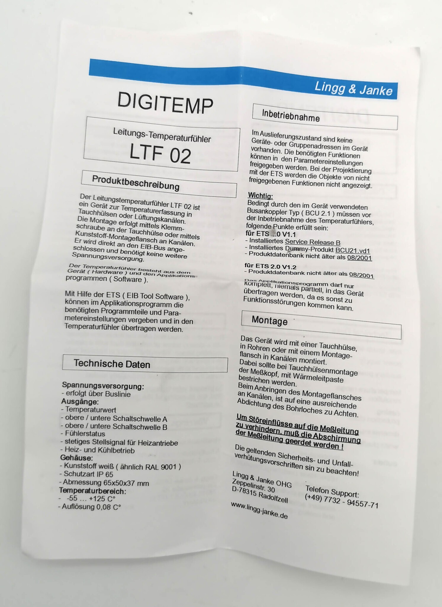 Датчик температуры для регистрации внутренней и наружной температуры Датчик температуры LINGG-JANKE (KNX sensor system) LTF02-1m (89104) от -55 до + 125 Co