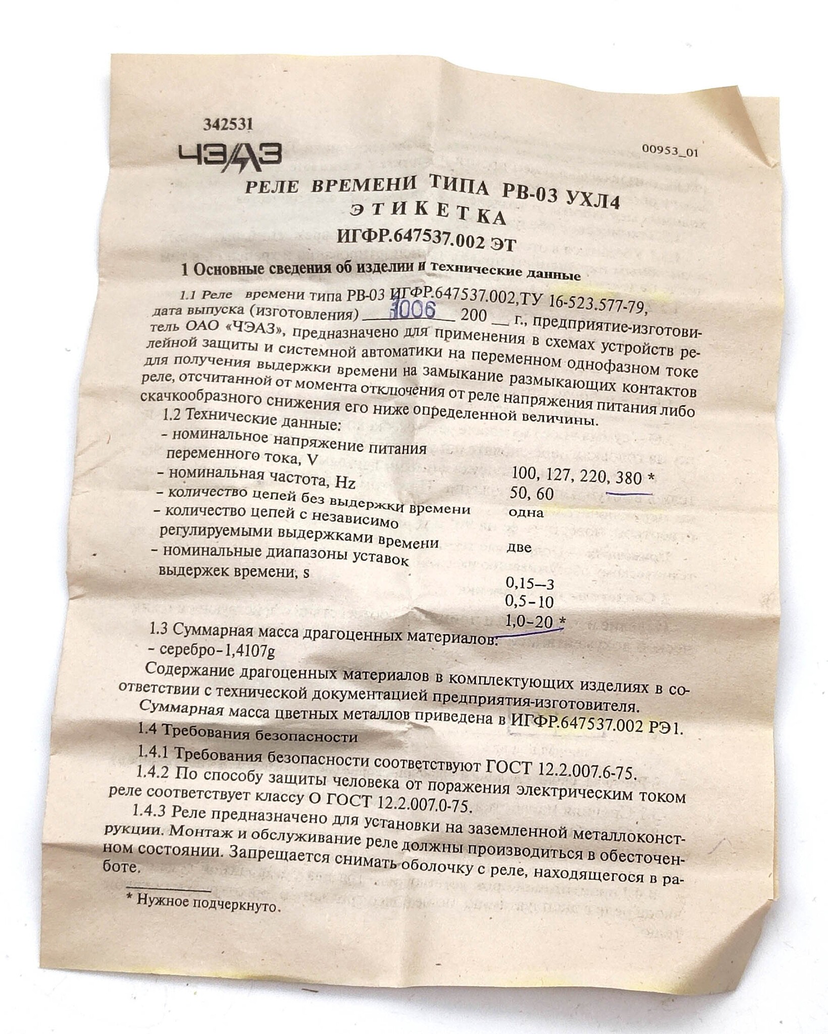 Product information "Реле времени ЧЭАЗ РВ-03 УХЛ4 ~380В 50Гц в.в 1-20с (260070643 01) ТУ16-523.577-79"