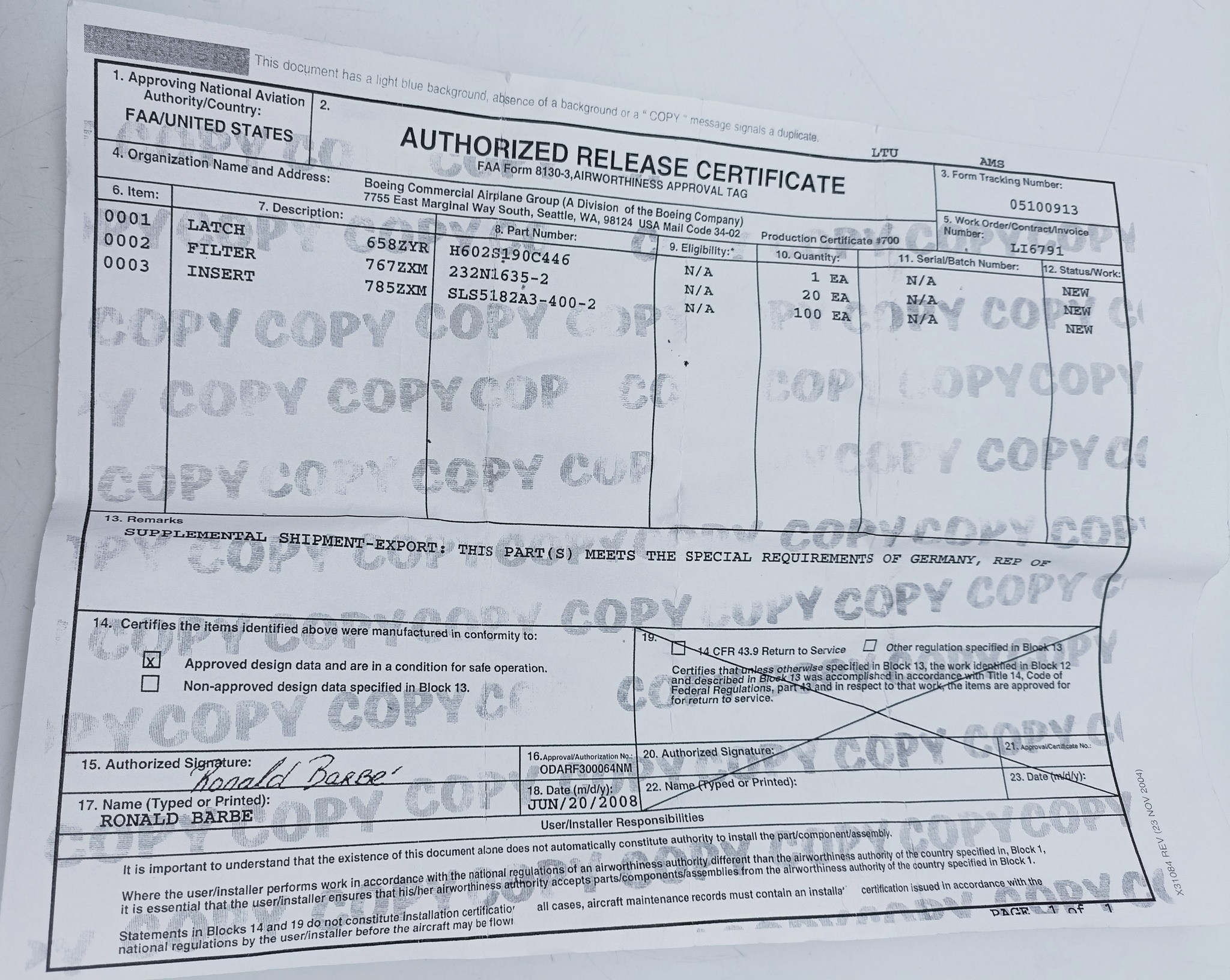 | Сертификат вид: | FAA/United States |